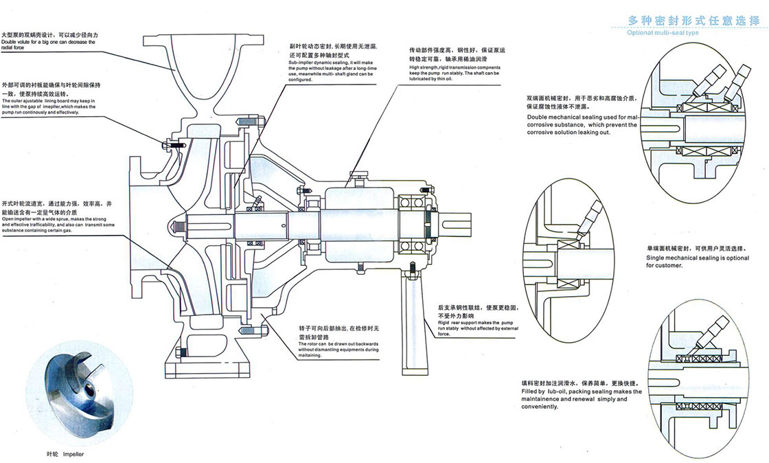 軸(zhóu)封型式包括:副葉輪動態密封(Y)、單端麵機械密封(S)、雙端(duān)麵機械密封(D)、填(tián)料密(mì)封(fēng)(P)。